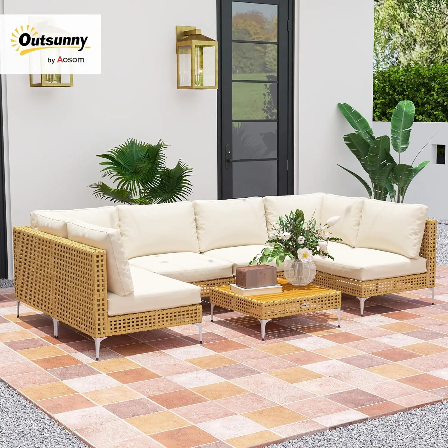 Transform your backyard into a stylish and comfortable oasis with this versatile outdoor furniture set. Designed for durability and elegance, it offers multiple configurations to fit any space. Key Features: - Modular Design: Includes two corner chairs, four single armless chairs, and a coffee table. Easily arrange them to create cozy conversation areas or spacious seating arrangements for gatherings. - Weather-Resistant Construction: Built with powder-coated steel frames wrapped in high-quality plastic wicker, ensuring long-lasting performance against sun, rain, and other outdoor elements while maintaining a chic appearance. - Enhanced Comfort: Enjoy relaxing moments with 3.9-inch thick seat cushions and 7.1-inch thick back cushions that provide superior support. The removable cushion covers are machine-washable for easy cleaning and maintenance. - Elegant Coffee Table: Features a slatted design made from painted acacia wood, offering a smooth and natural surface perfect for holding drinks, snacks, or decorative items during outdoor events. - Practical Specifications: Corner chair dimensions: 28.7" W x 28.7" D x 25.6" H; Single chair dimensions: 25.6" W x 28.7" D x 25.6" H; Table dimensions: 25.6" W x 25.6" D x 12.2" H; Weight capacity per seat: up to 352 lbs.; Table weight capacity: up to 110 lbs.; Assembly required with clear instructions included. Ideal for patios, gardens, or poolside areas, this set combines functionality with aesthetic appeal to enhance your outdoor living experience.