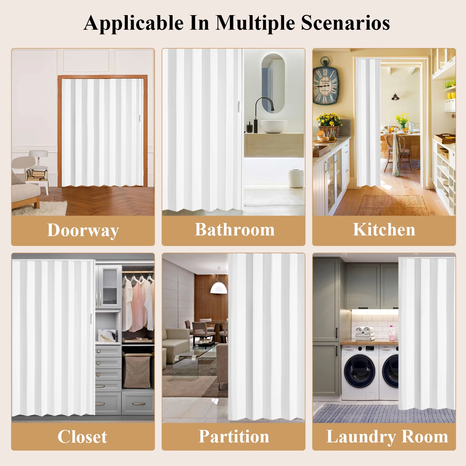 "Our PVC Folding Door is made with PVC material and an innovative ABS wheel design that makes it easy to open and close. With a door body thickness of 0.63 inches, it's perfect for meeting your maximum demand for space utilization while avoiding the problem of tripping hazards or collecting debris. <br/>Specifications: