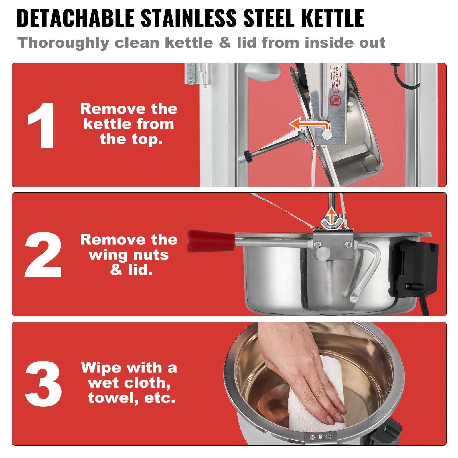 Durable Structure, Easy to Clean: Constructed with a sturdy cold-rolled plate frame and tempered glass panels, this popcorn machine is built for heavy-duty use. The machine features a magnetic latch door for easy access and a visually appealing design, while the kettle lid is easily removed for quick cleaning with a wing nut. Regular cleaning will help prolong the machine's life and maintain its pristine appearance.