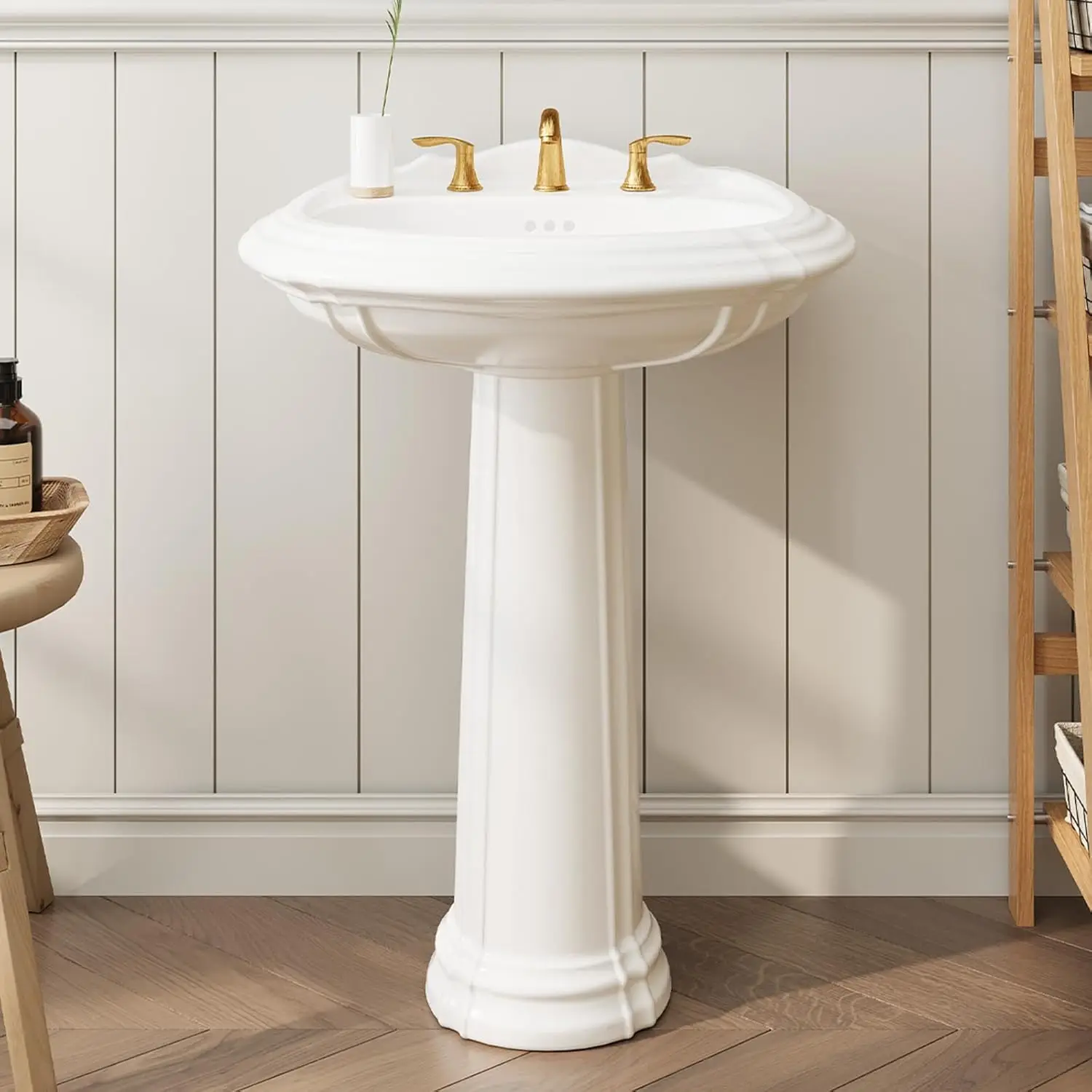 Upgrade your bathroom with this elegant freestanding ceramic pedestal sink, designed to bring both timeless style and practical function to your space. Made from premium vitreous china, the pedestal sink features a glossy white finish that resists scratches and stains, making it easy to keep clean and looking new. Its classic silhouette and compact footprint suit a variety of bathroom decors, from traditional to contemporary.