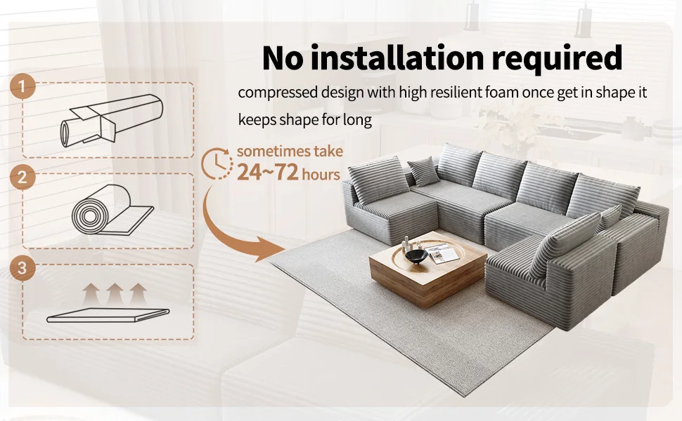 As the sofa is shipped by vacuum compression, there may be size deviation when it is first unpacked, it is suggested that waiting 72 hours, for the lounge sofa to fully rebound to a consistent height.