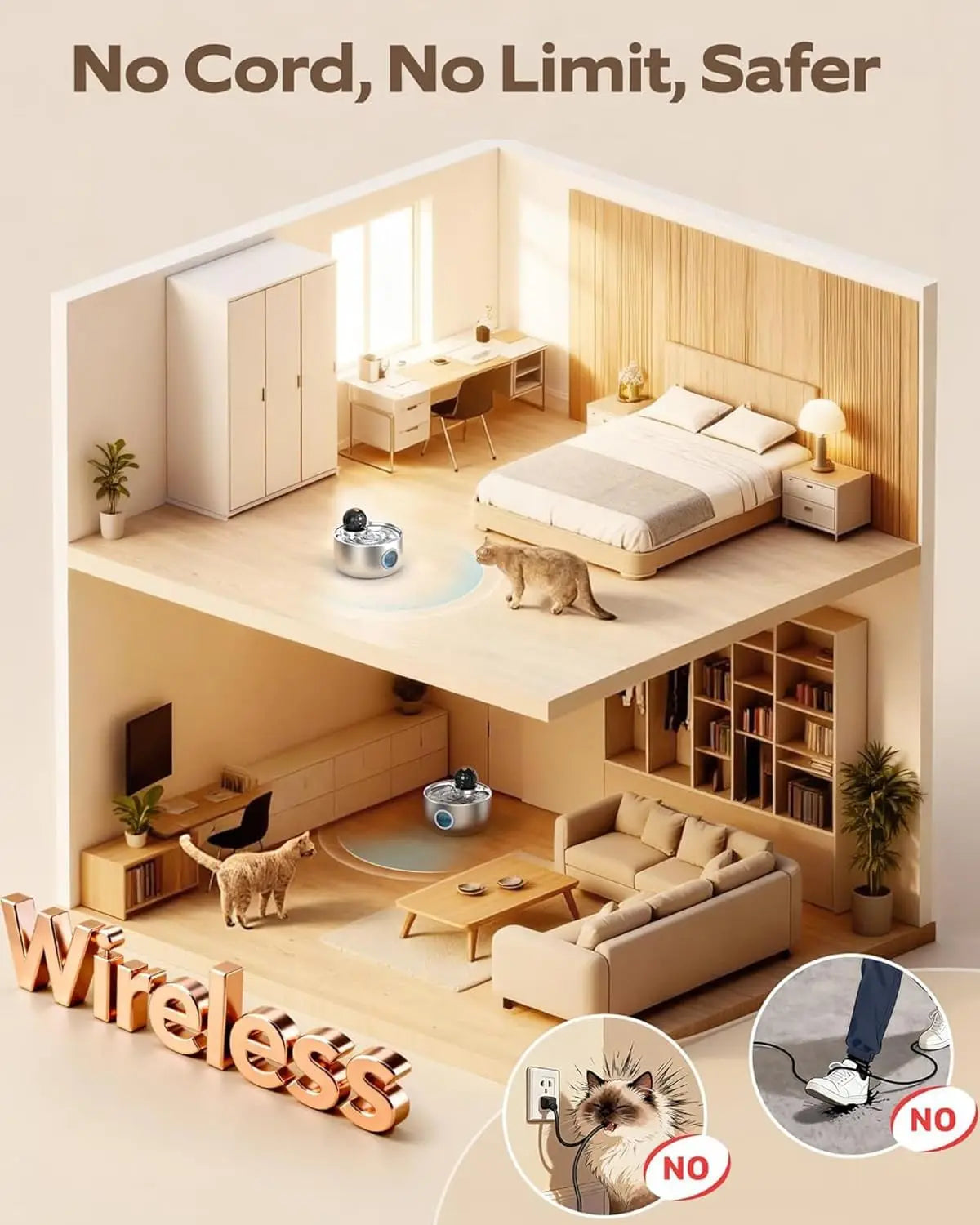 Upgrade your cat's hydration with our innovative cordless water fountain, designed for convenience and health. This battery-powered fountain operates wirelessly, making it perfect for indoor use without the hassle of cords. Featuring a large 2.6-liter capacity, it ensures your pet has access to fresh water throughout the day. The rechargeable design saves on battery costs and is eco-friendly. Key Features: - Cordless Operation: Enjoy freedom from tangled wires; simply place the fountain anywhere in your home. - Battery Powered: Runs on rechargeable batteries for portable use, ideal for travel or power outages. - Large Capacity: Holds 2.6 liters of water to keep your cat hydrated without frequent refills. - Automatic Waterer: Maintains a continuous flow of fresh water to encourage drinking and prevent stagnation. - Water Level Window: Easily monitor water levels at a glance to ensure timely refilling. - Included Accessories: Comes with 8 filters and 8 sponges for long-term maintenance and clean water supply. Benefits: 1. Promotes Hydration: The flowing water attracts cats, encouraging them to drink more and stay healthy. 2. Easy Maintenance: Simple setup and cleaning process; filters help remove impurities for pure water. 3. Safe Design: Made from pet-safe materials with no sharp edges or harmful chemicals. 4. Quiet Operation: Low-noise pump ensures a peaceful environment for both you and your pet. 5. Versatile Use: Suitable for cats of all sizes and ages, providing reliable hydration indoors. This product is an excellent choice for pet owners seeking a reliable, user-friendly solution to keep their cats well-hydrated