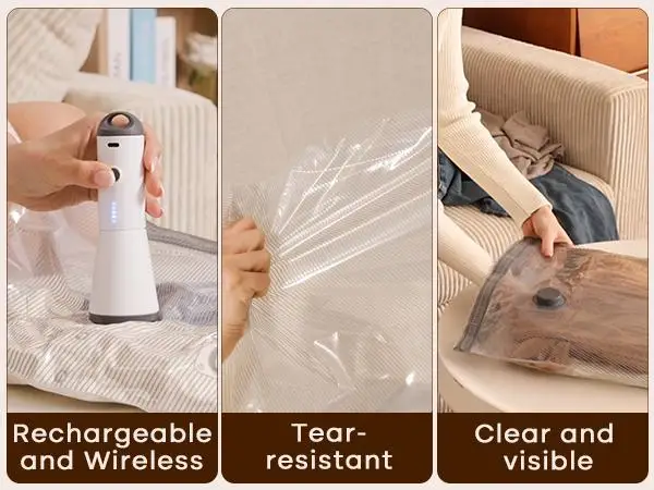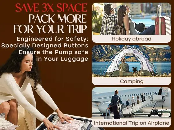 📦 3 Sizes: 15.8×19.7in, 15.8×23.6in, 19.7×23.6in. These bags reduce luggage volume by up to 80%, making them versatile for packing. The lightweight and slim design makes the pump easy to hold and fits seamlessly into luggage, backpacks, or handbags.
