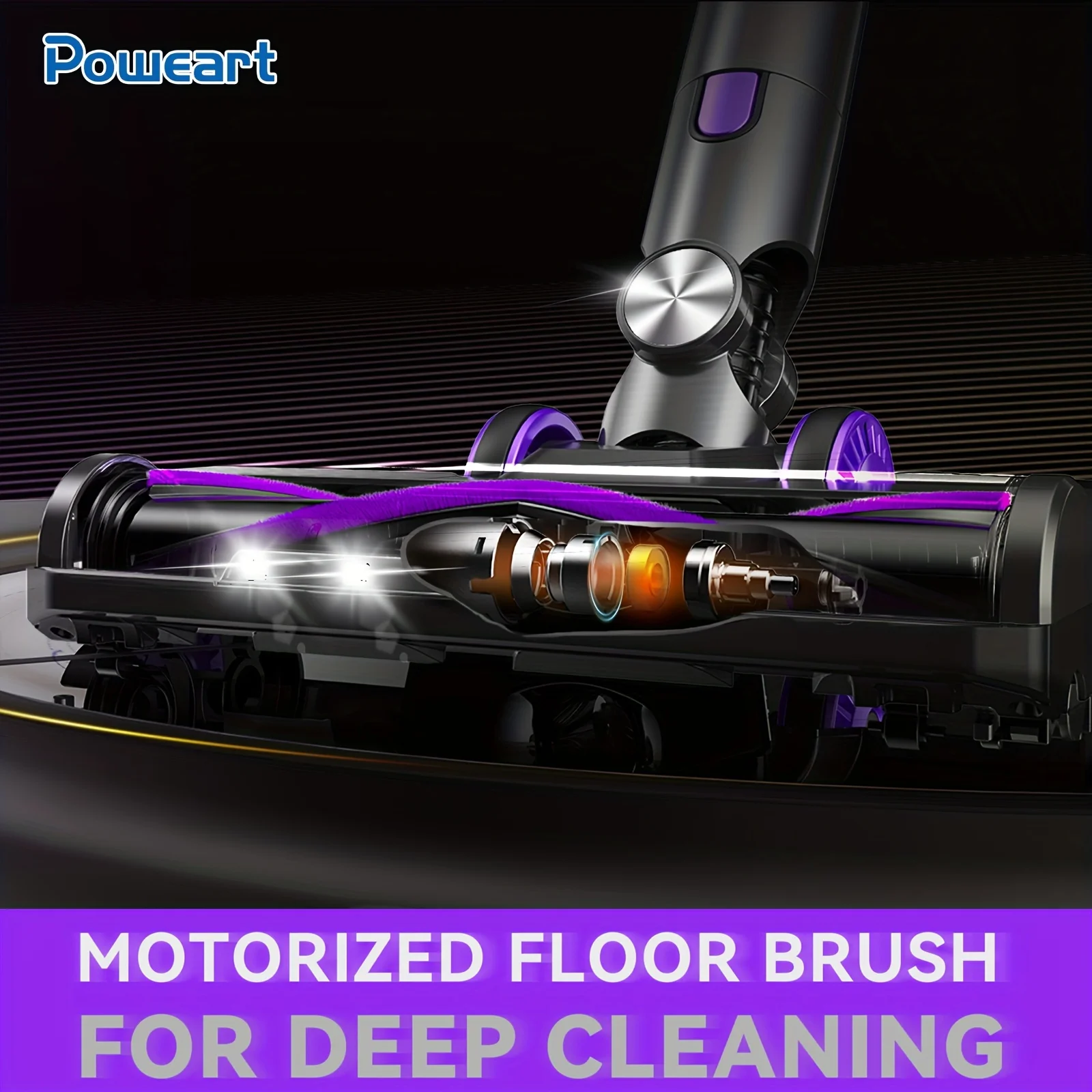 [LED Motorized Floor Brush] The V-shape bristle brush roll picks up dust and dirt more efficiently, making for powerful cleaning for both floors and low pile carpets. LED headlights illuminate hidden debris around the home.