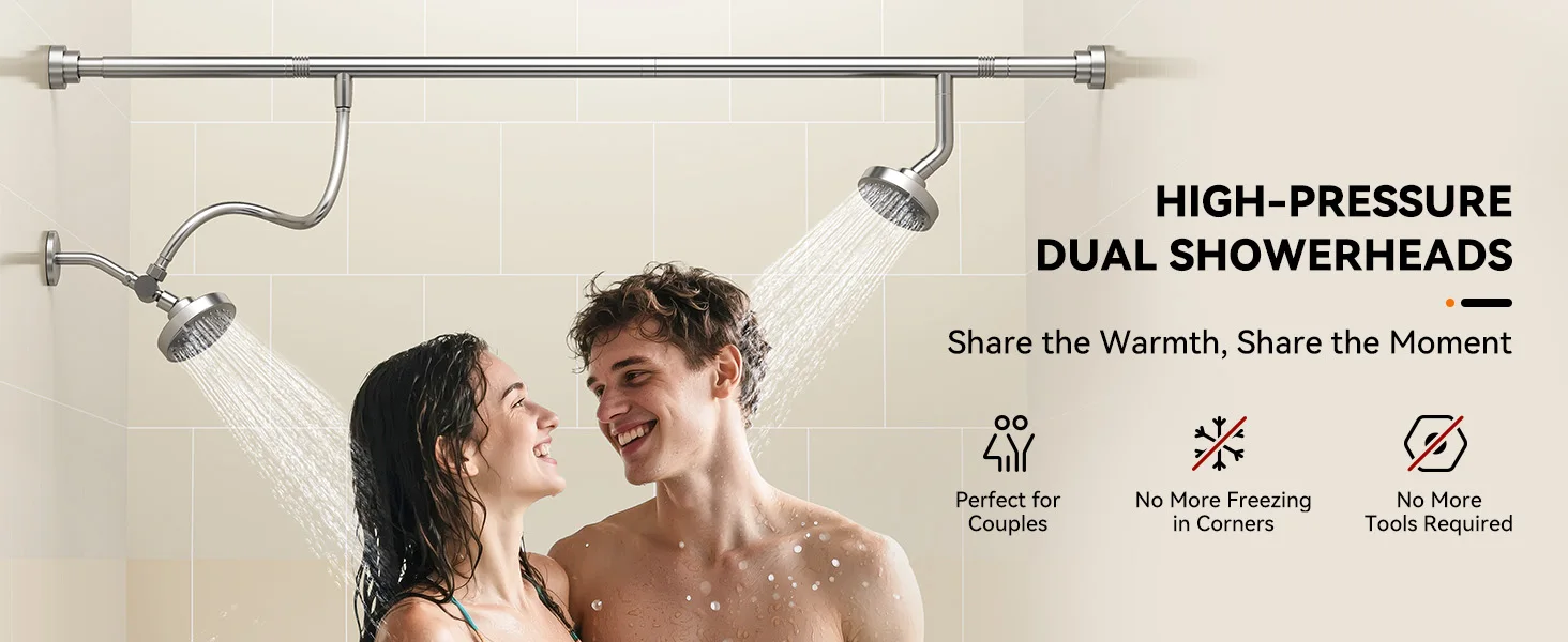 [Upgraded 304 Stainless Steel]: Made with premium stainless steel – the same trusted metal used in quality kitchen sinks. Naturally resists rust and hard water stains. Wipe clean in seconds, stays looking new for years. No peeling, no discoloration, just reliable double showers.