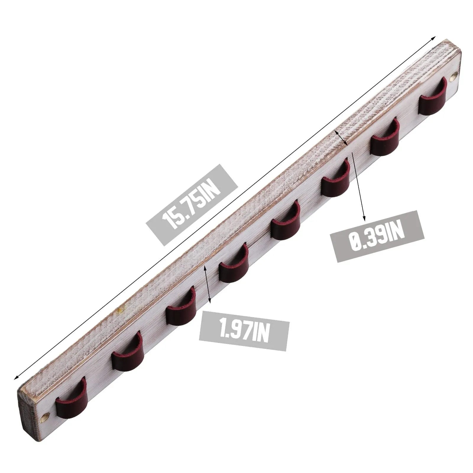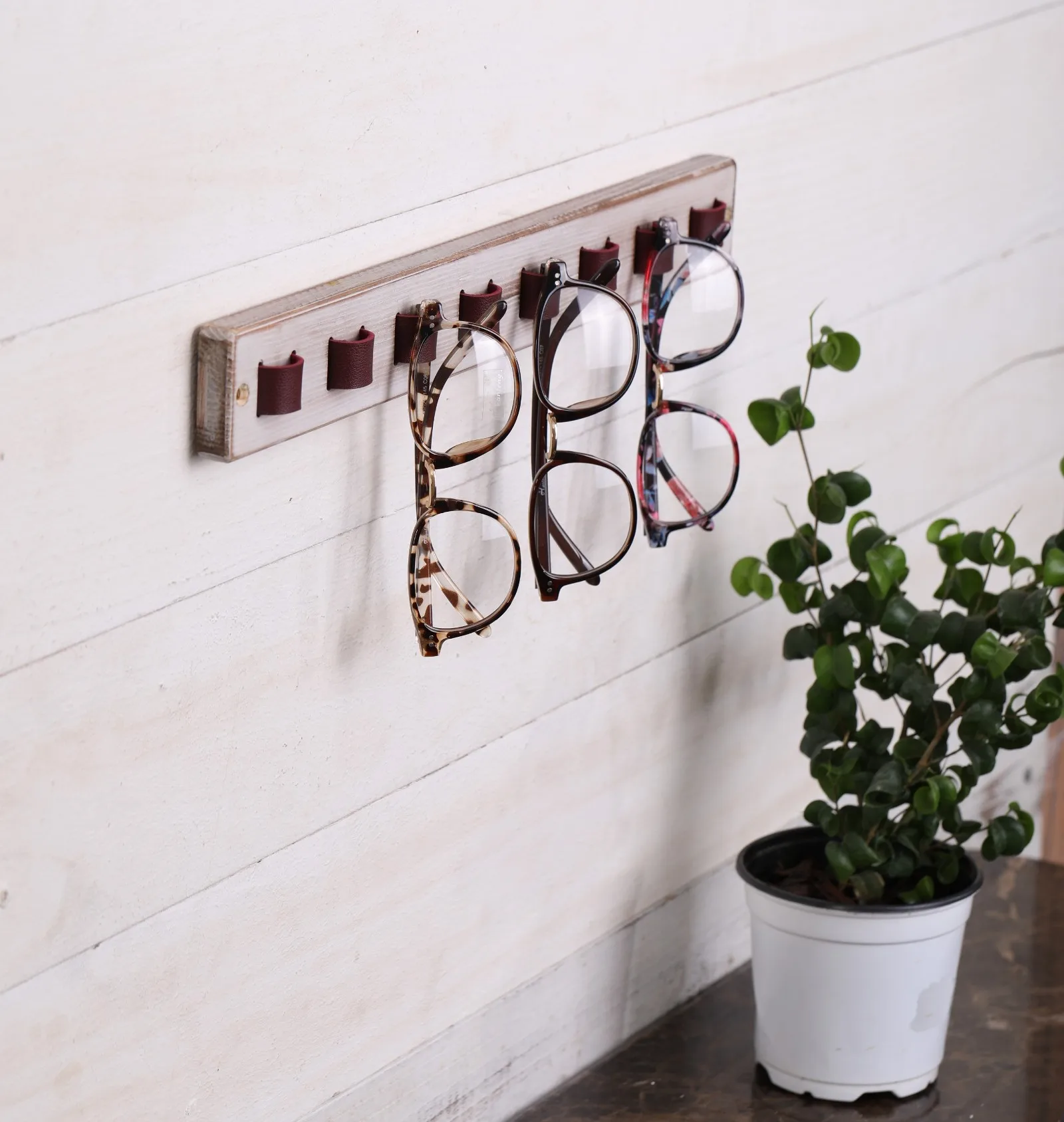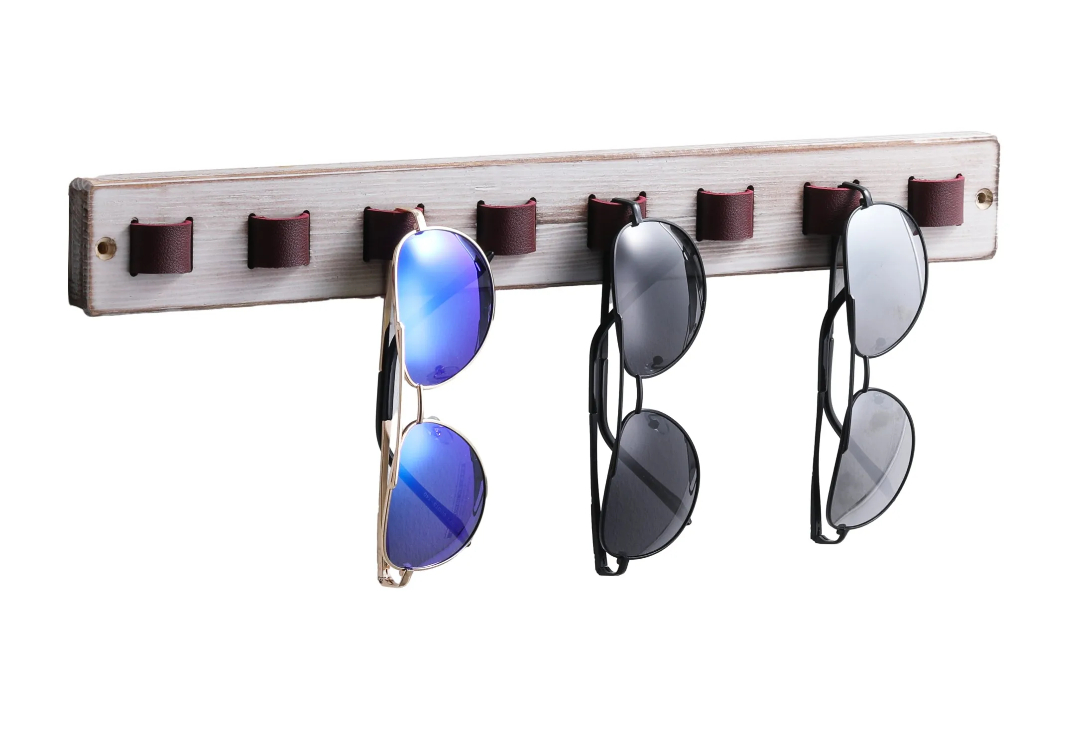 Wood wall mounted sunglasses organizer with leather straps makes it seem very high-end