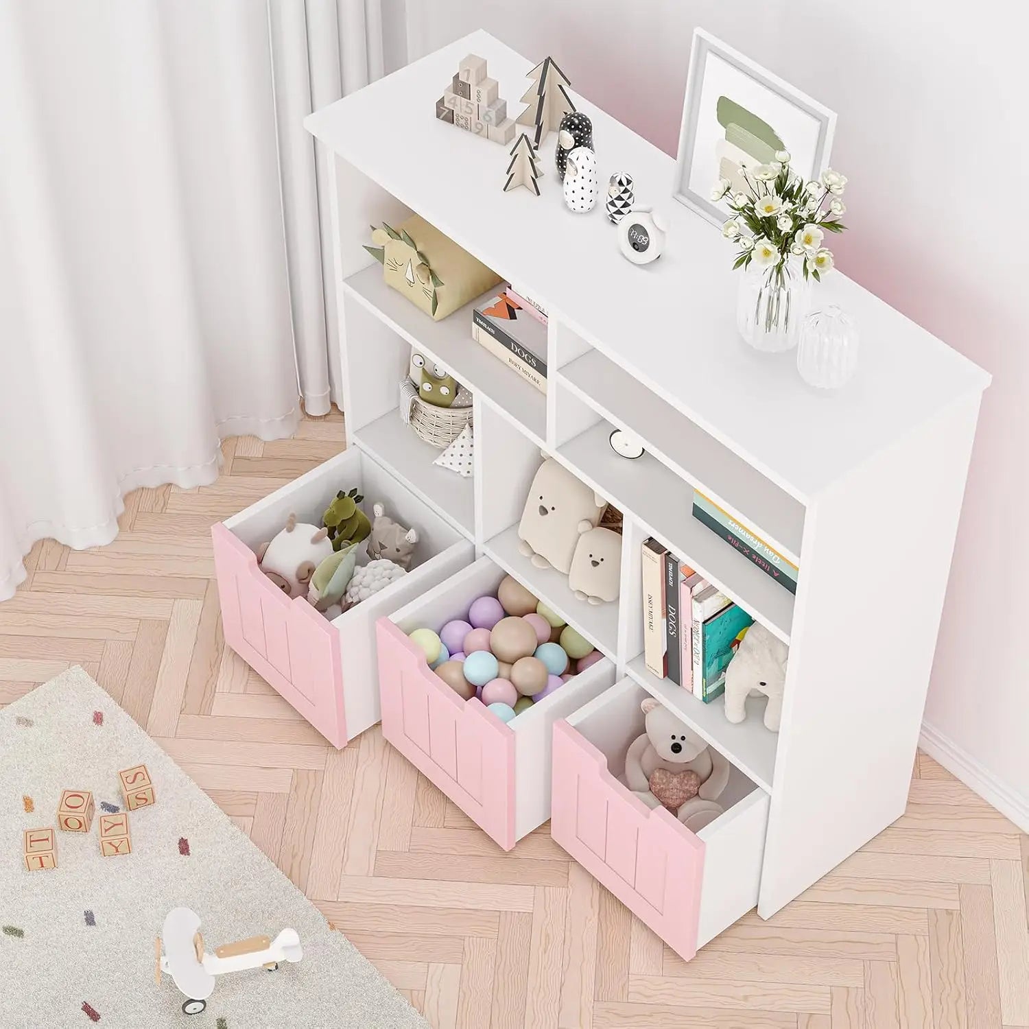 Versatile Toy Storage & Display: Store books, toys, and art supplies in 6 compartments + 3 smooth-gliding drawers. Large top surface holds lamps, plants, or decor. Hidden wheels allow easy room-to-room movement.