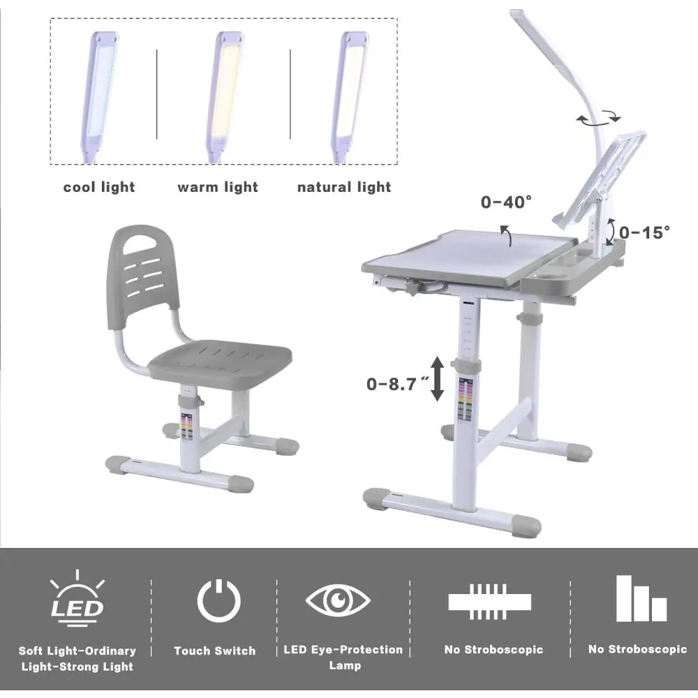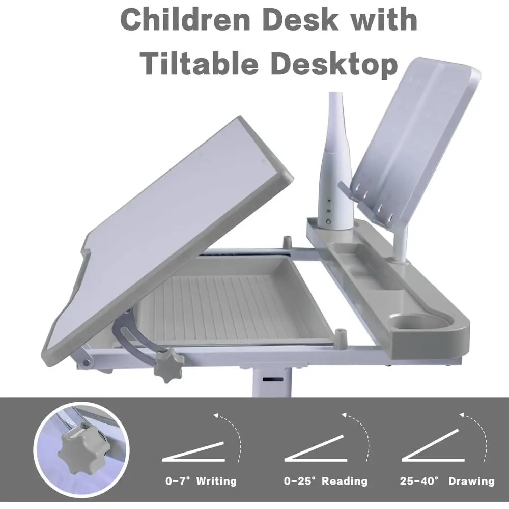 Are you still worried about your child's lack of a good learning environment? A good learning and growth experience is very important for children. The ergonomic kids desk and chair set can protect vision, correct the child's sitting posture and accompany children's healthy growth. We use High Quality MDF Material for long time use and convenient for cleaning and wiping, and Height Adjustable Design is suitable for 3-15 years old kid or teenager, and Large Slide-Out Tray for storing learning stationery scientifically. Tiltable Desktop Design makes study more funny (0°-7° for Writing; 0°-25° for Reading; 25°-40° for Drawing),and Detachable LED Light for protecting eyes(Cool light for Learning; Natural light for Reading; Warm light for Resting).