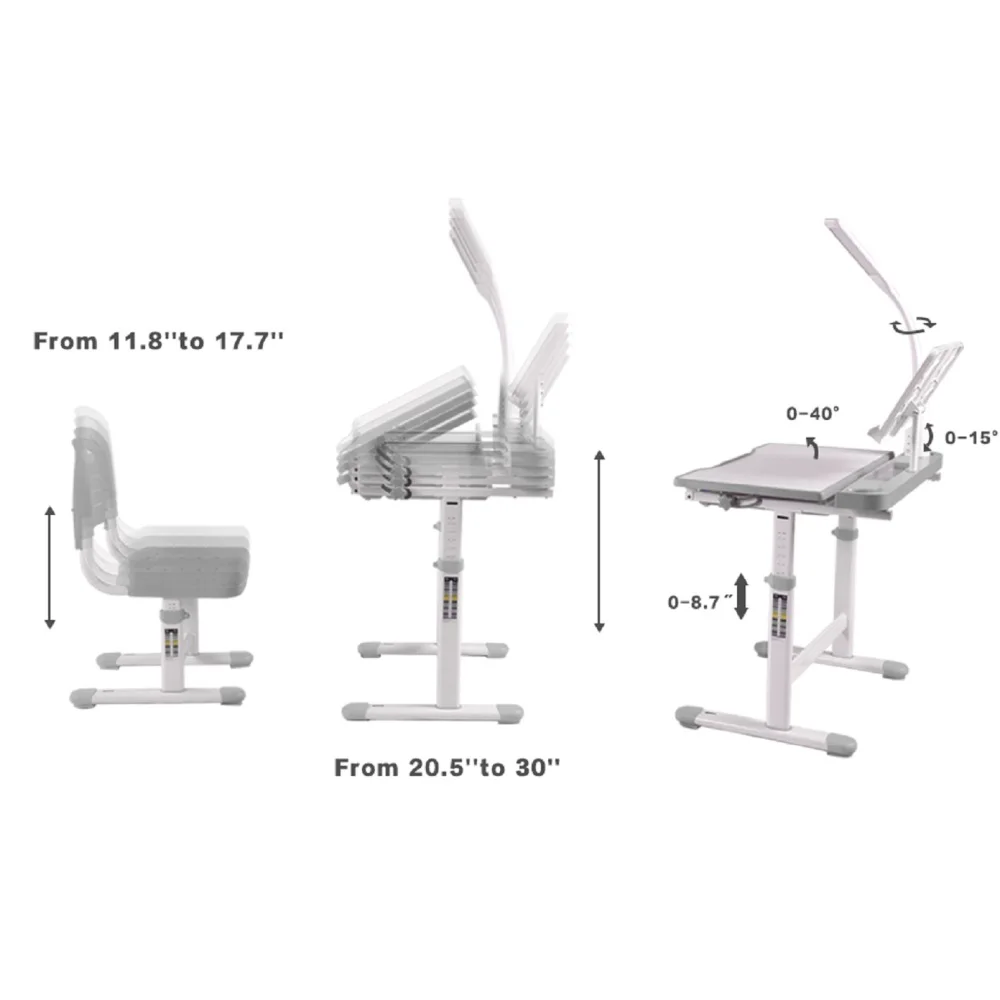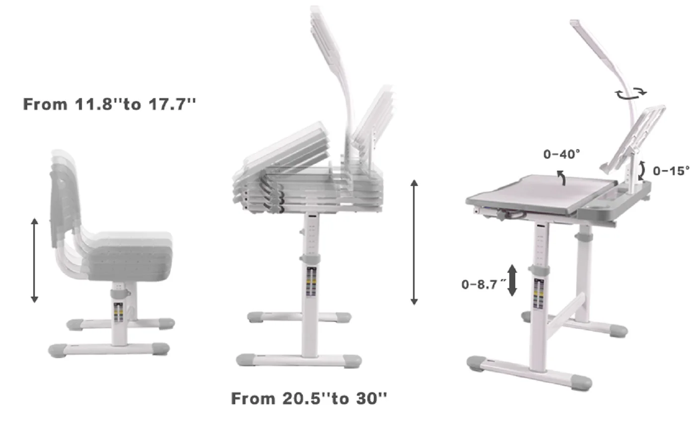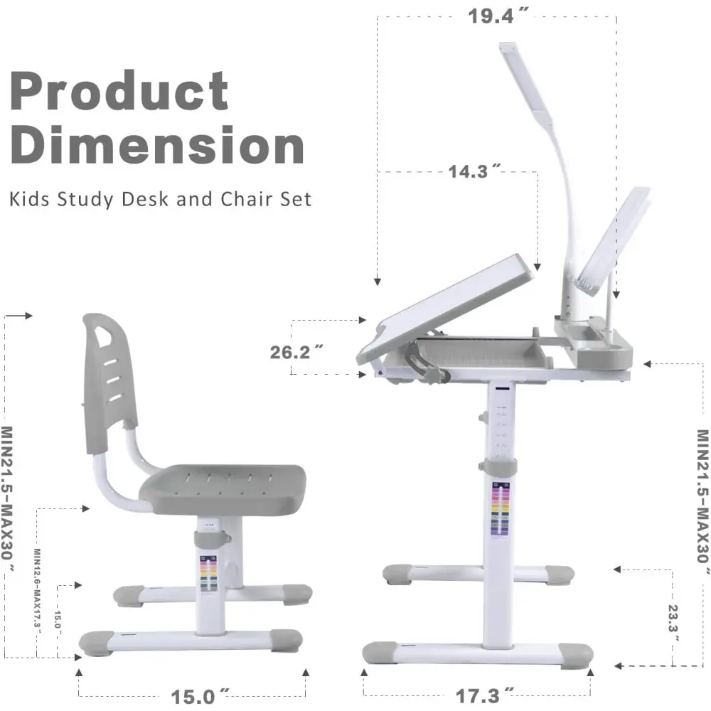 | Chair Size 15.0" x 15.0" x 21.3"-30" | Package Included 1 x Adjustable Height Desk; 1 x Adjustable Height Chair; 1 x Eye-Care LED Lamp; 1 x Reading Book Shelf; 1 x Small Toy Bucket; 1 x Bag Steel Hook; The Required Install Accessory Kit. |