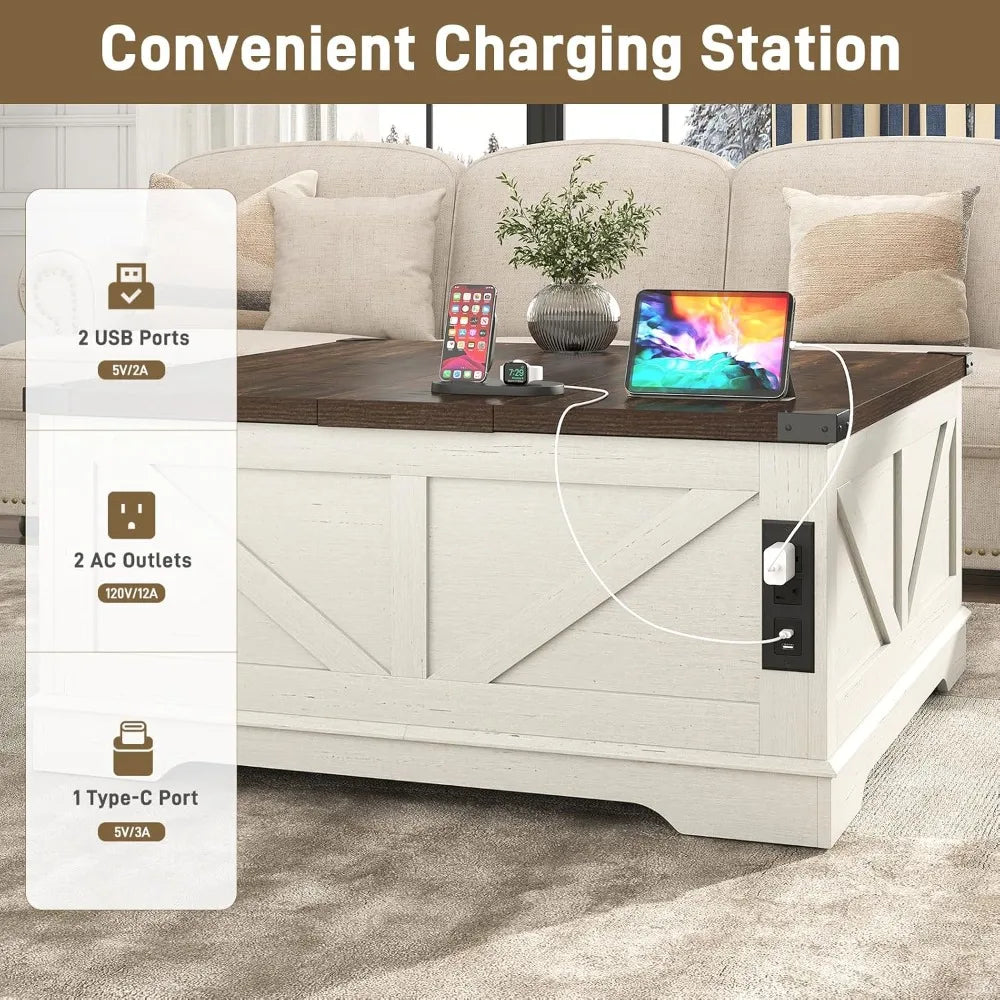 - 40" x 40" Large Farmhouse Square Coffee Table: Our white farmhouse lift top square coffee table with storage adopts a unique 40" x 40" large size design, which is very suitable for large living rooms and large spaces. Classic barn door appearance, rustic original wood grain finish and metal corners combine design bring a warm farmhouse aesthetic. Complement for living rooms and suit for any modern or rustic rooms.