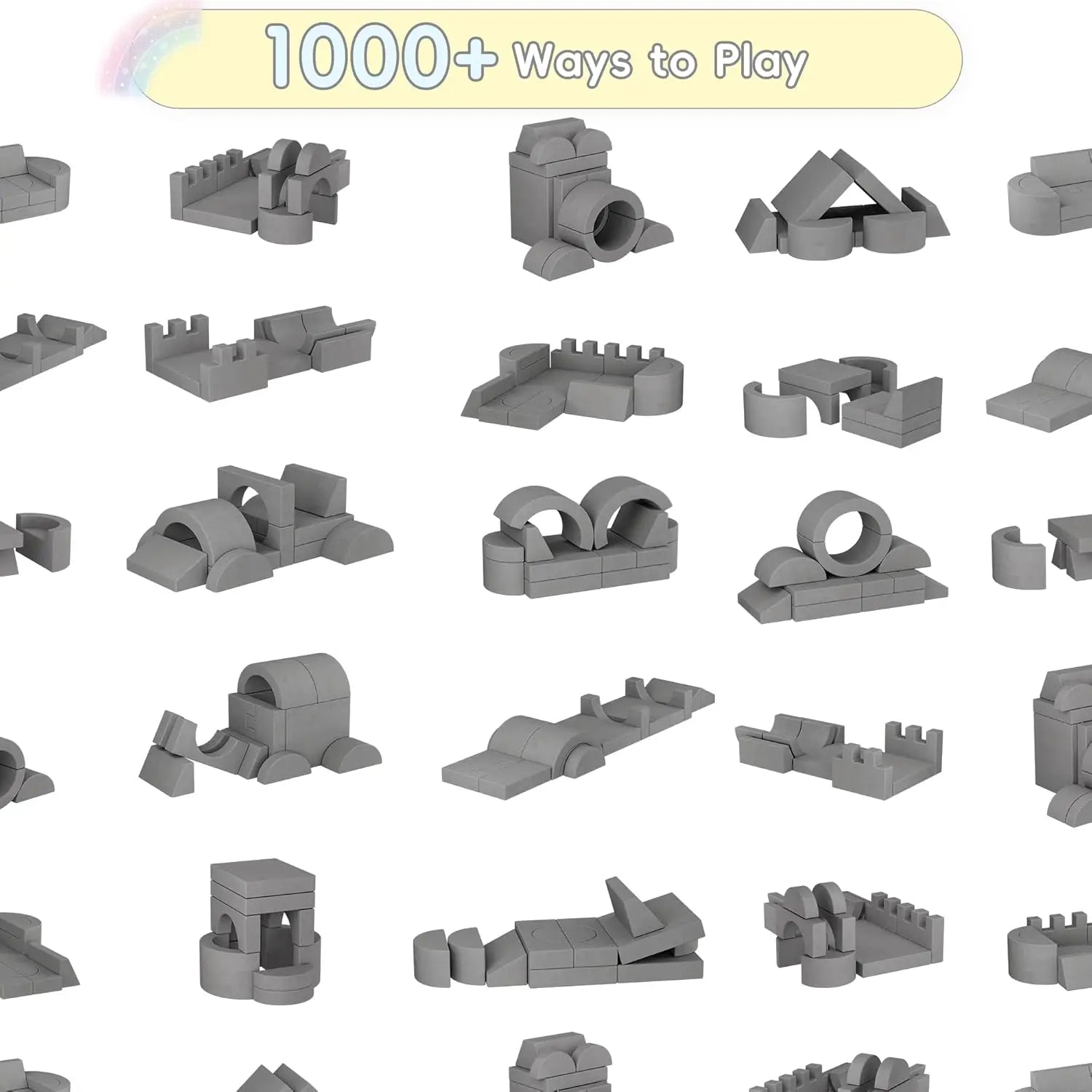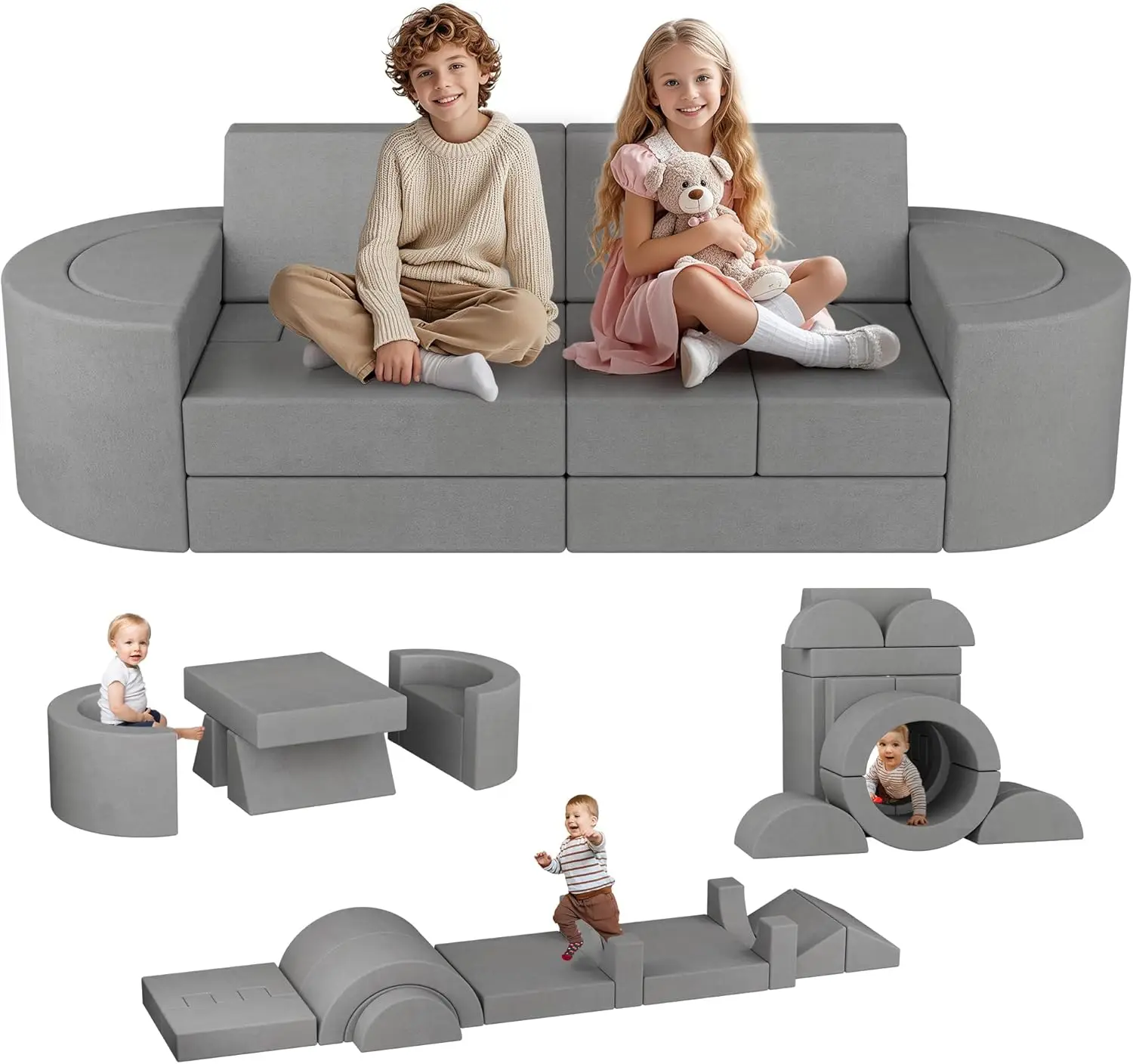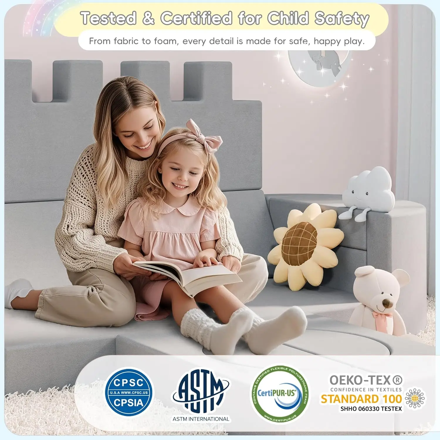 Discover endless play possibilities with our modular kids play couch! This set includes 8 unique shapes (2 of each) that inspire over 1,000 combinations—build castles, tunnels, slides, cozy forts, or reading corners to spark your child's imagination. Extra-large design for more fun: Measuring 68 inches long by 26.5 inches deep by 19.5 inches high, this oversized play couch offers a spacious and immersive experience compared to standard models. It's perfect for multiple children to play or lounge together comfortably. Built for comfort and support: Crafted with high-density foam, this kids sofa provides the ideal balance of softness and stability. Whether climbing, jumping, or relaxing, children enjoy lasting comfort and safe support during all activities. Safe and parent-approved: Our modular kids play couch meets CPC, CPSIA, OEKO-TEX, and CertiPUR-US standards. It is free from harmful substances like formaldehyde and heavy metals. Made with child-safe materials and quality foam ensures a healthy environment for playing building and relaxing. Easy-to-clean durable covers: The soft machine-washable velvet cover makes cleanup simple after snack spills or playtime dirt Just remove the covers toss them in the wash—they stay vibrant shrink-free after every cleaning cycle. Important note before use: The play couch is compressed for shipping After unpacking unzip fabric covers let foam expand fully over 48–72 hours For quicker fluffing try low-heat blow dryer or steamer to remove wrinkles quickly.