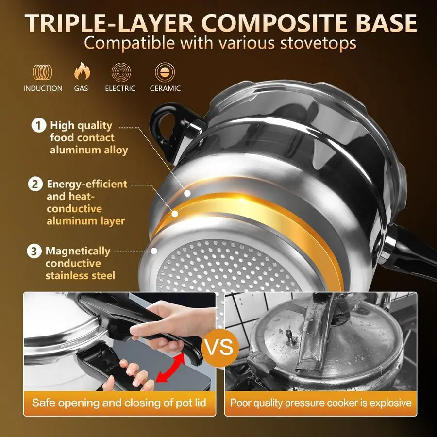 Versatile CompatibilityIncludes a steamer rack for a wide variety of cooking needs. Our pressure cooker is designed to work with various stovetops, whether its gas, induction, or ceramic. Effortlessly create delicious meals no matter your cooking setup.