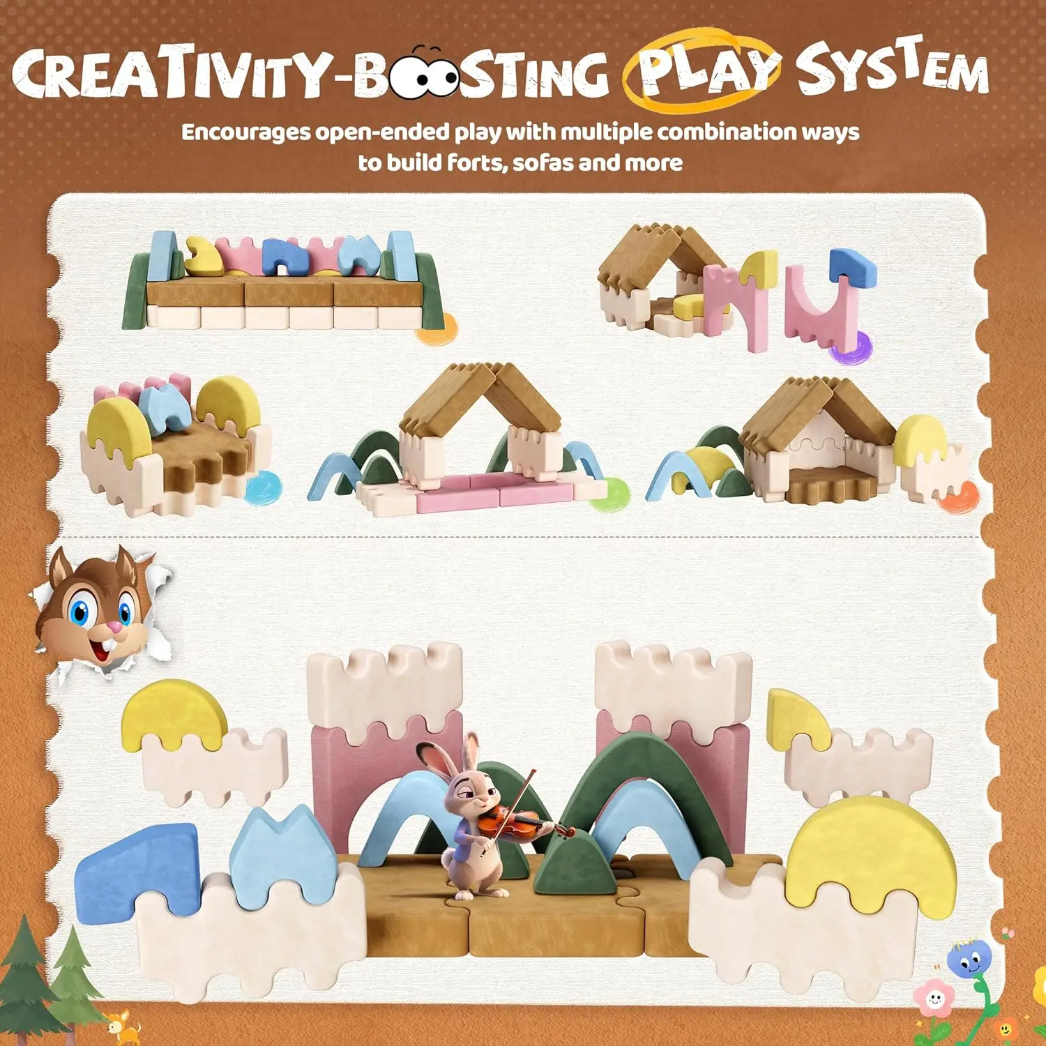 Transform your child's play space with this versatile 22-piece modular play couch. Designed to inspire creativity and active play, this set offers endless possibilities for fun and learning. 【Jungle-Themed Design】Featuring vibrant jungle-themed patterns in warm, inviting colors, this play couch sparks imagination and encourages storytelling. The visually appealing design complements any room decor while providing a stimulating environment for children. 【Modular & Convertible Construction】With 22 interchangeable foam pieces, children can build forts, tunnels, reading nooks, or comfortable seating areas. The modular design allows for countless configurations to keep playtime fresh and engaging. When assembled as a standard couch, it measures approximately 64.5 inches in length, 25.1 inches in width, and 19.6 inches in backrest height. 【Safe & Durable Materials】Constructed with child safety in mind, all pieces feature soft rounded edges and no hard surfaces. The high-density foam is CertiPUR-US certified for non-toxic safety, ensuring worry-free lounging and play. Durable tear-resistant fabric covers withstand daily use from jumping and tumbling. 【Easy Maintenance Features】Removable machine-washable covers make cleanup simple after snacks or arts and crafts activities. Stain-resistant fabric helps maintain a clean appearance with minimal effort. The lightweight design allows children to rearrange pieces independently while parents appreciate the easy maintenance. 【Versatile Space-Saving Solution】Perfect for playrooms bedrooms or living areas this compact set expands to accommodate group playdates or individual relaxation time It serves as both functional furniture and an educational toy alternative encouraging screen-free active play while developing motor skills and creativity 【Educational Benefits】Beyond entertainment this modular system promotes problem-solving spatial awareness and cooperative play Children learn through building different structures fostering cognitive development in an enjoyable hands-on manner The versatility supports various age-appropriate activities from toddler nesting games to older children's construction projects
