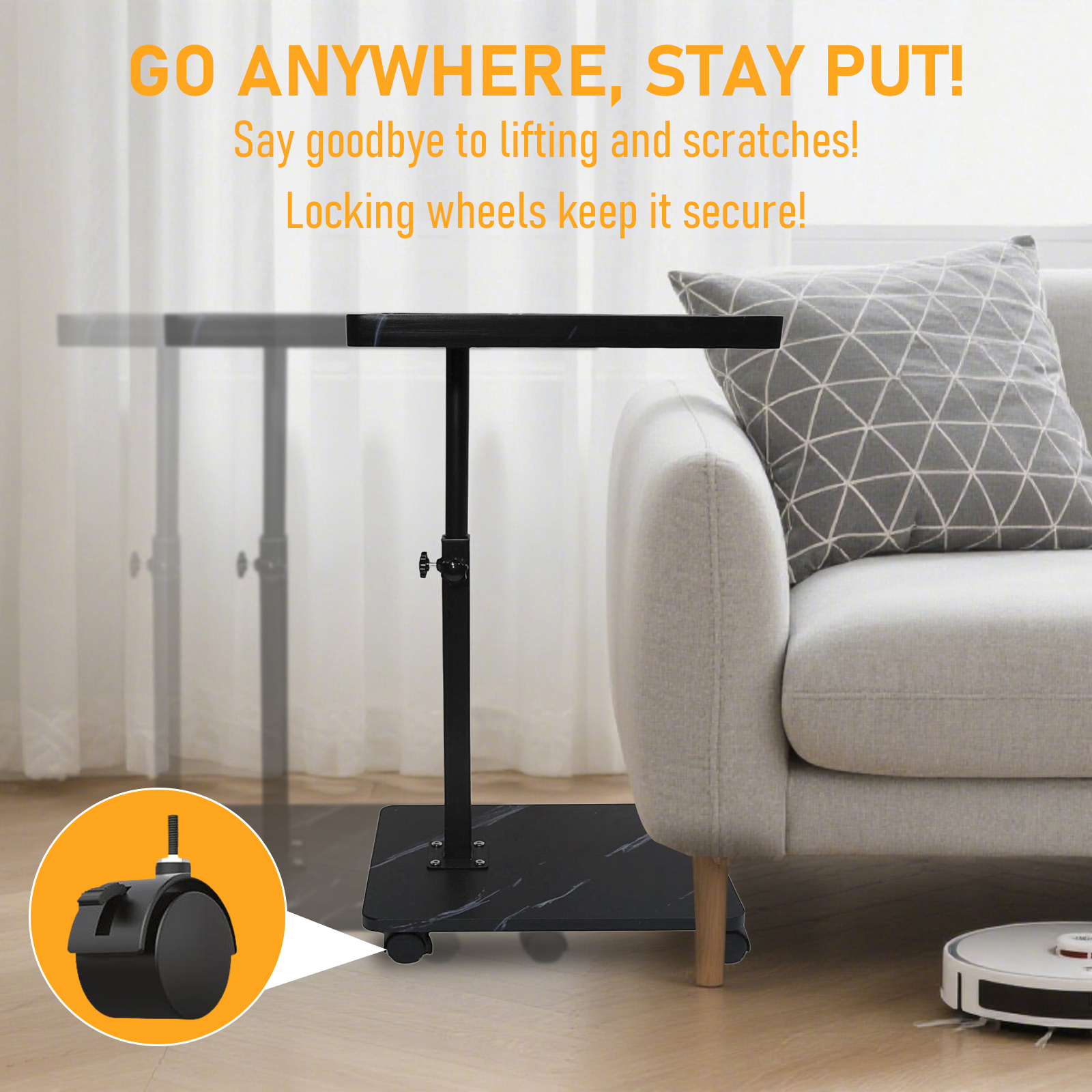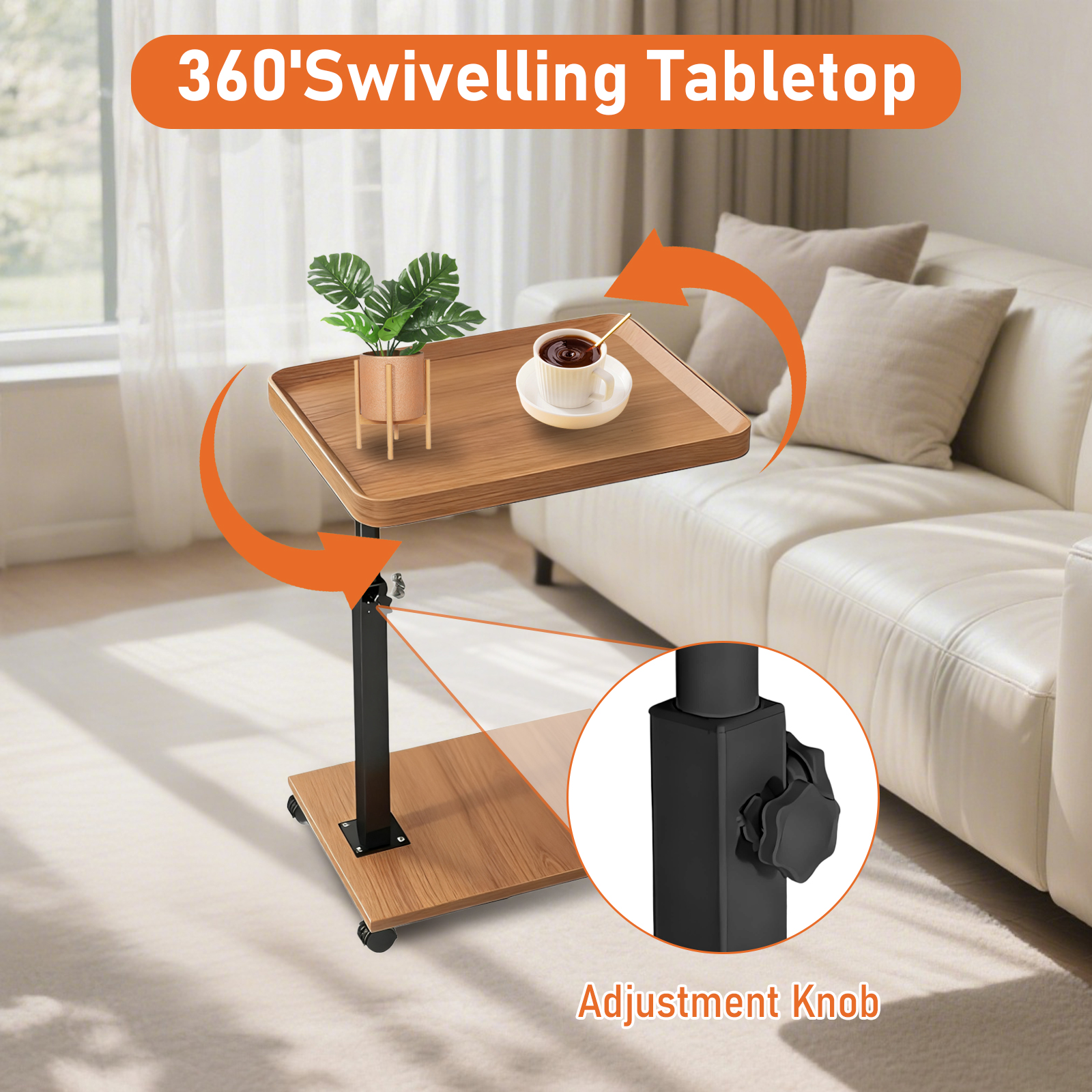 【C-Shape & 360°Swivel Design】 C shaped side table with wheels size is 11.8'D x 15.7'W x 31.5', lightweight and easy to move, can be swiveled 360° to adjust to a more comfortable angle, so it can be easily fit into the gap between sofas or beside the bed.