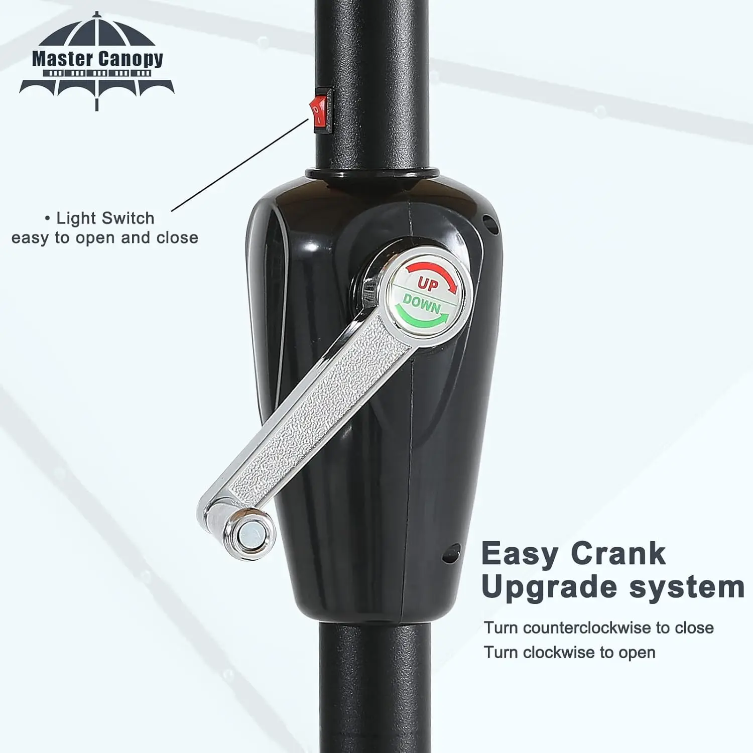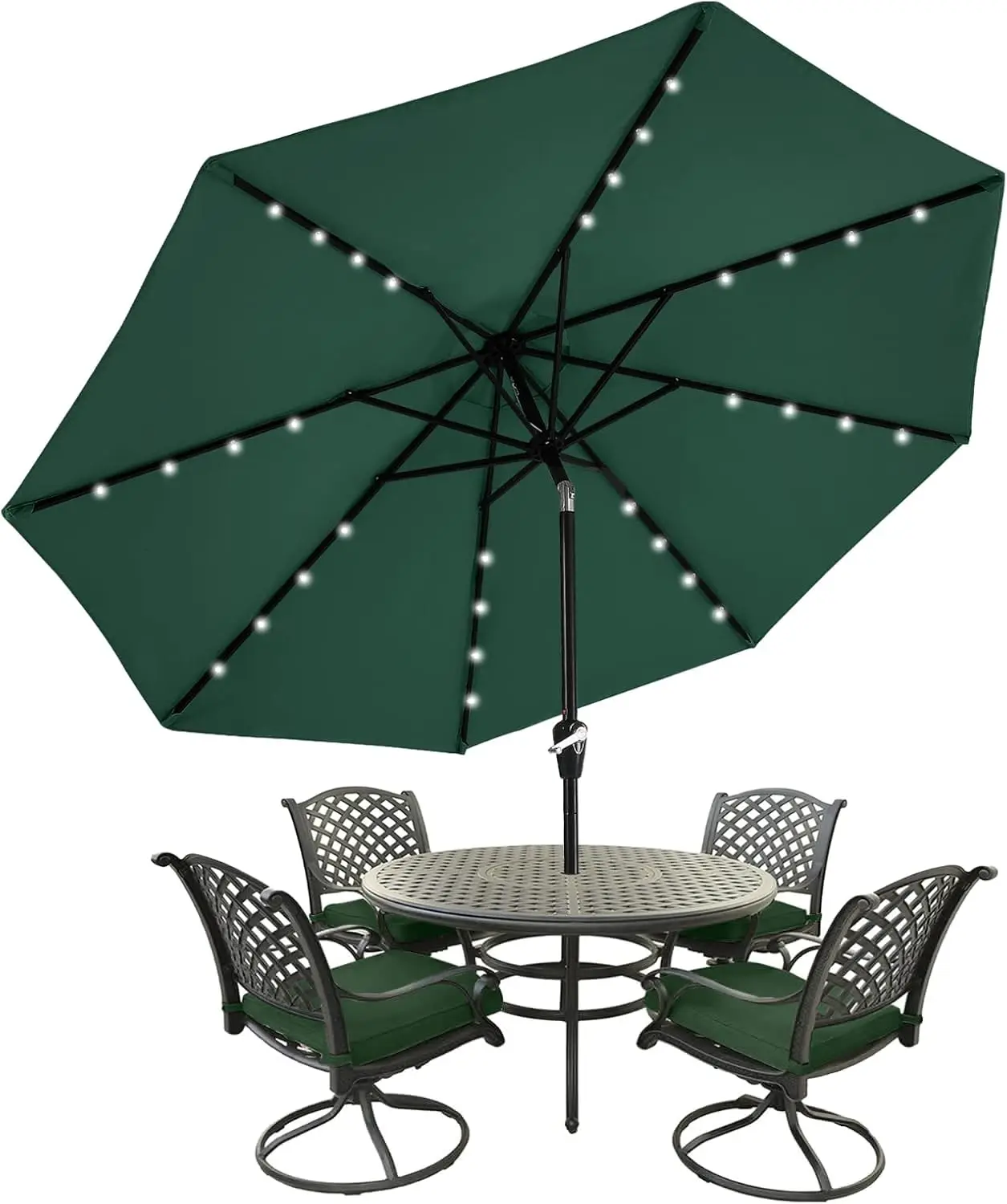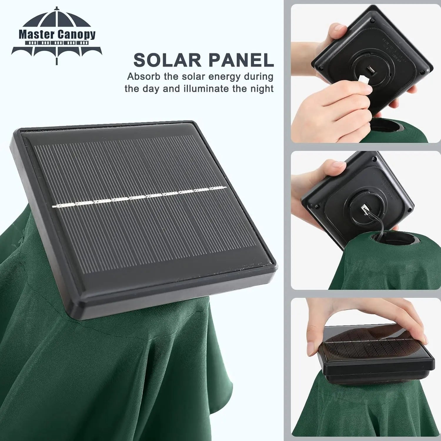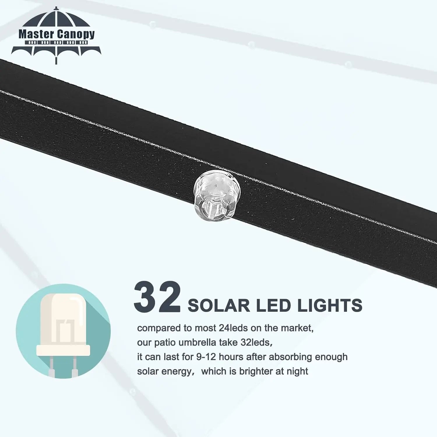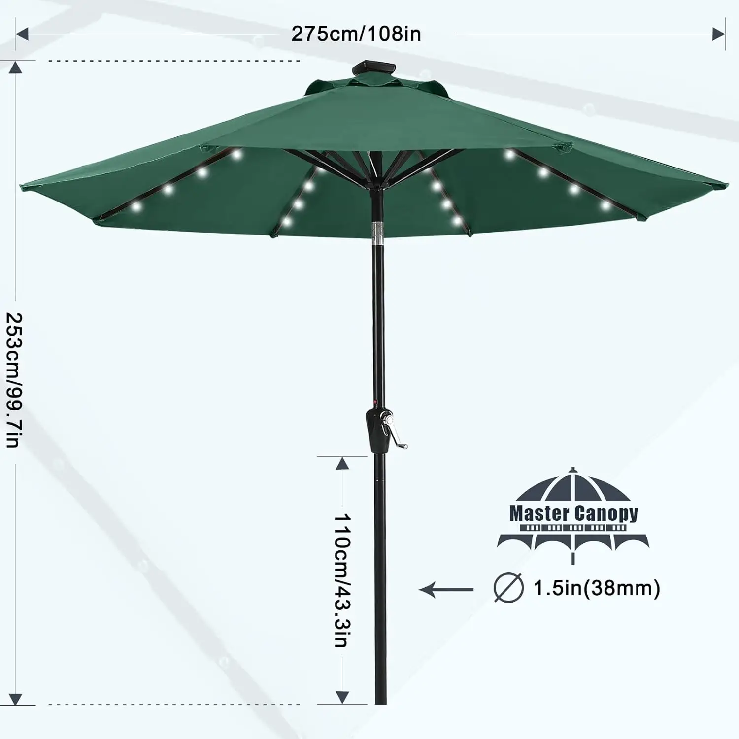 Enhance your outdoor living space with this premium patio umbrella, designed for durability and convenience. Key features include: · **Solar-Powered LED Lighting**: Equipped with 32 energy-efficient solar LED lights that provide up to 12 hours of illumination after a full charge. The built-in ON/OFF switch allows easy control, while the top-mounted solar panel eliminates the need for electricity or power cords, making it eco-friendly and cost-effective. · **Sturdy Construction**: Features a heavy-duty aluminum pole that resists rust and corrosion for long-lasting use. Reinforced with 8 solid iron ribs to ensure stability and durability in various weather conditions. · **Large Shade Coverage**: Offers a generous 108-inch diameter canopy made from waterproof and breathable fabric. It provides ample shade and protection from rain, perfect for patios, gardens, balconies, decks, picnic tables, and both residential and commercial settings. The unique tilting mechanism allows you to adjust the umbrella to maximize shade coverage as the sun moves. · **Easy Assembly and Storage**: Designed for hassle-free setup with a detachable pole and user-friendly crank handle. It can be quickly assembled or disassembled for convenient storage when not in use. · **Versatile Use**: Ideal for multiple outdoor applications such as patios, gardens, balconies, decks, poolside areas, restaurants, cafes, and event spaces. Its robust design ensures reliable performance in diverse environments. **Important Notes**: Before initial use, please check the plug connection by unscrewing the solar panel to ensure proper functionality. If any issues arise with the lights after setup, contact customer support for assistance—we are committed to resolving problems promptly. Note that a base is not included; you may need to purchase one separately based on your setup requirements. This patio umbrella combines style with practicality, offering enhanced lighting and durable construction to elevate your outdoor experience year-round.