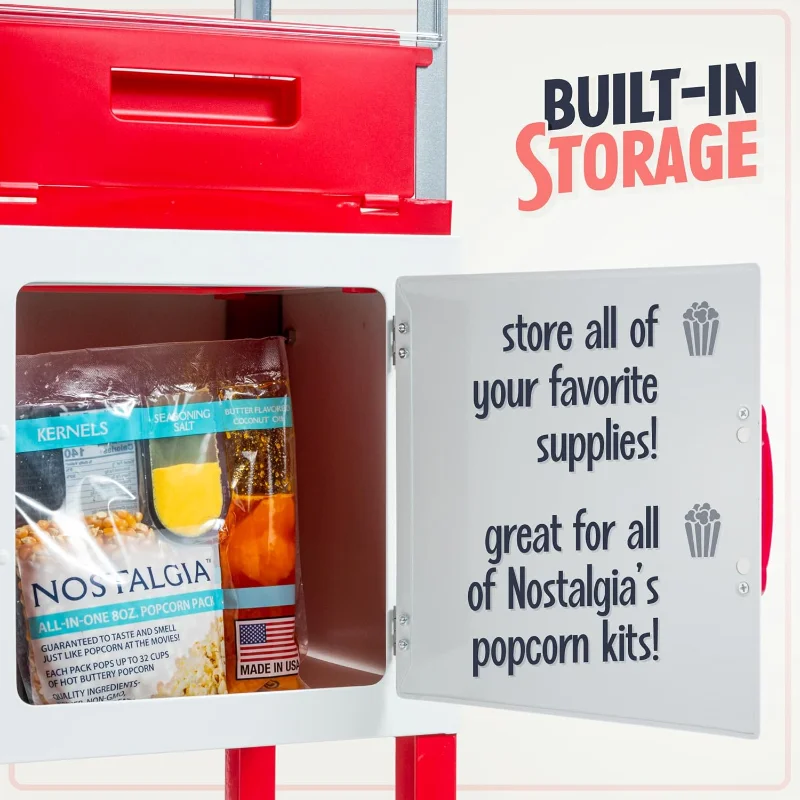 - KITS AND SUPPLIES: All Nostalgia popcorn kits work with this popcorn popper machine. Try the Theater Hot Air & Kettle Kit, Popcorn Oil, Seasoning Packs, Reusable Popcorn Bowls, and the Pre-Measured Coconut Oil Popcorn Kit.