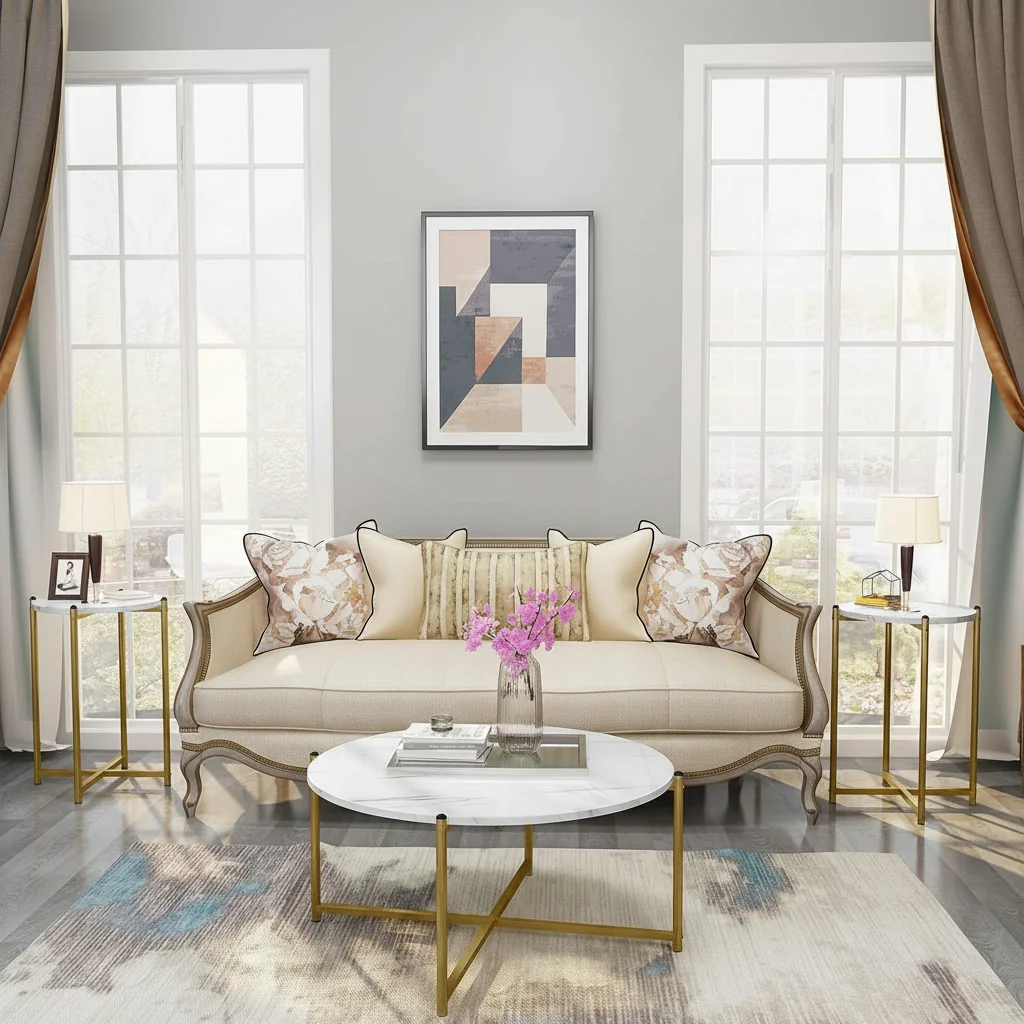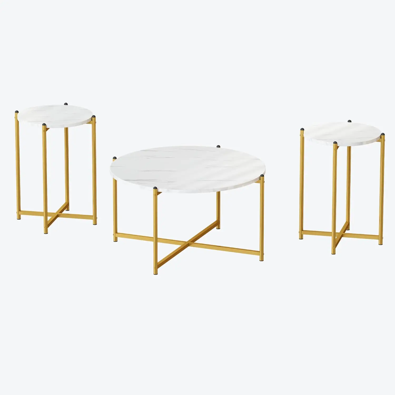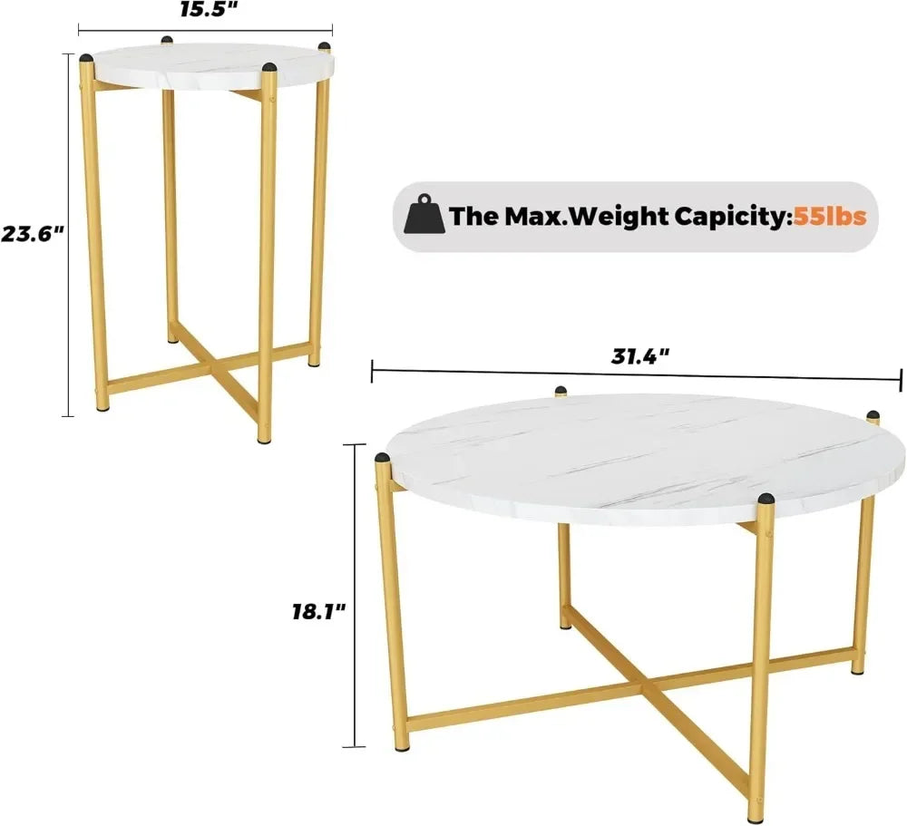 【Elegant Home Upgrade】Transform your living space with this sophisticated 3-piece coffee table set featuring a stunning faux marble finish. The contemporary round tabletops paired with sleek metal cross bases create an upscale ambiance that elevates any room's decor while maintaining practical functionality. 【Exceptional Craftsmanship】Constructed from high-density MDF with durable metal legs, these tables offer remarkable longevity. The smooth surface resists water damage and scratches, ensuring lasting beauty. All wood components are FSC-certified, reflecting our commitment to sustainable materials and environmental responsibility. 【Stable & Secure Design】The innovative X-base structure provides exceptional stability during daily use. Four adjustable metal feet protect your flooring from scratches while maintaining perfect balance. Rounded corners and smooth edges ensure family safety, making these tables ideal for homes with children or pets. 【Versatile Applications】Use this versatile set individually or as a complete ensemble to meet various needs. The main coffee table serves perfectly for tea service and entertaining guests, while the two smaller tables function excellently as bedside companions, sofa-side organizers, or display surfaces for decorative items and reading materials. 【Simple Assembly & Maintenance】Quick assembly takes approximately 10 minutes with all necessary hardware and clear instructions included. The non-porous marble-like surface wipes clean effortlessly with a damp cloth. Dimensions: Coffee table measures 31.4" diameter x 18.1" height; Side tables measure 15.5" diameter x 23.6" height each. 【Space-Smart Solution】Perfect for apartments, condos, and compact living spaces where style meets functionality. The coordinated design creates visual harmony while the practical sizing maximizes usable surface area without overwhelming your room layout.