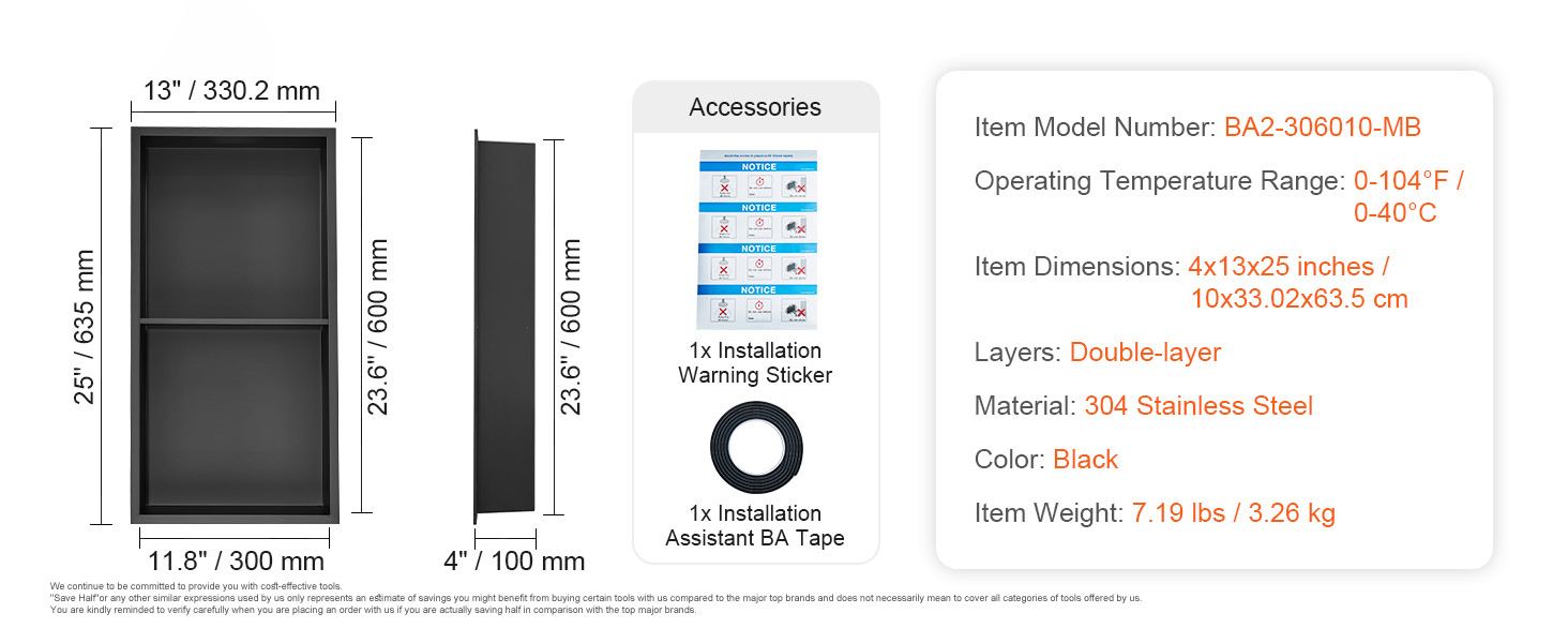 The niche can be installed horizontally or vertically, which is convenient for you to choose according to the layout of the shower room and personal preferences to meet different space needs—placed inside walls to save bathroom space.