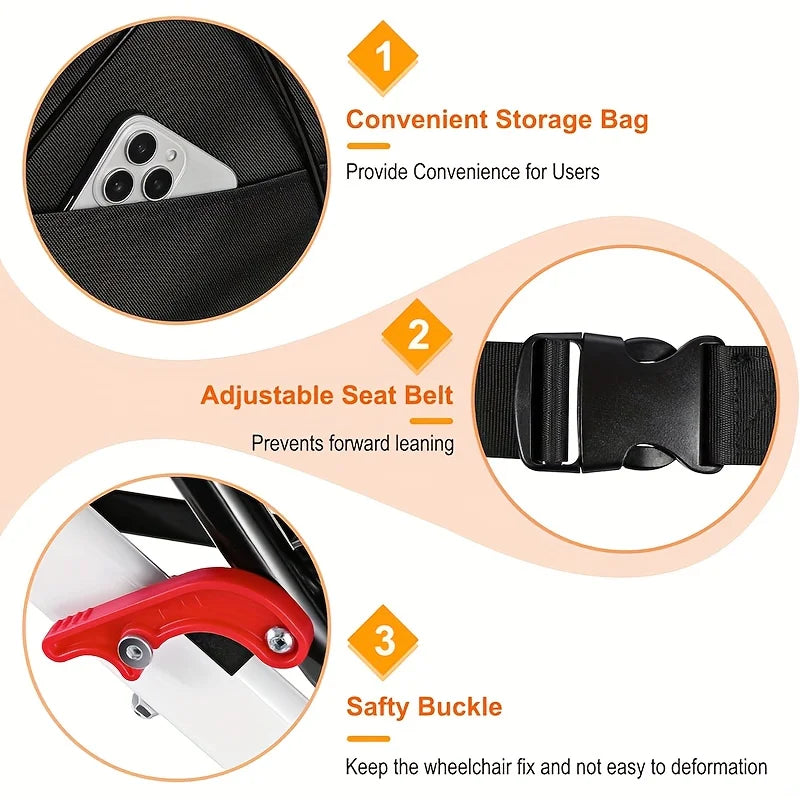 [Attention to Detail] The safety buckle design enhances the stability of the wheelchair when it is used outside the home. The seatbelt must be opened before folding the wheelchair. Adjustable footrests and handrails are also provided, allowing for easy adjustments to your preferred position. The seatbelt helps prevent slipping and adds an extra layer of safety. There is a small pocket at the back of the wheelchair for storing essentials and small items.