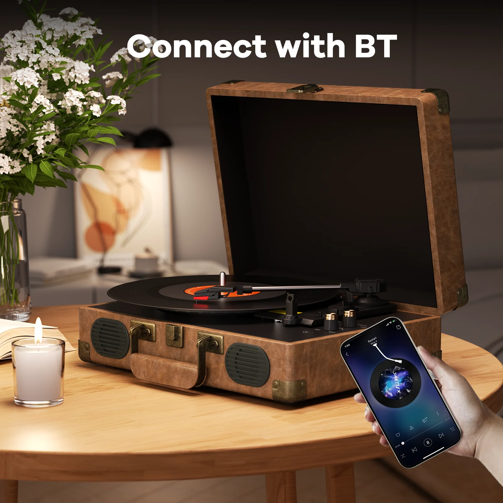 【Four Available Connection Choices】Music streaming digital audio via turntable built-in Bluetooth speakers. Hook up external speakers through RCA output or Aux-in line for non-Bluetooth devices like MP3. You can use your headphones to get private listening. Just seize the day with music.